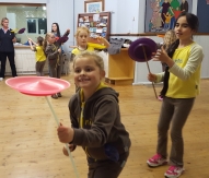 3rd Hastings Brownies tried their hand at Circus Skills. they had a go at plate spinning, diablo, juggling with scarves,beanbags,balls and also tyring to control devil sticks. The evening was led by Andy Bosco who goes around various clubs and organisations teaching circus skills. All of the Brownies acheived their Circus skills badge in the evening.